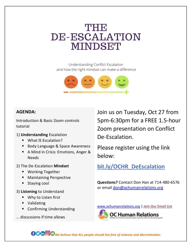 OC Human Relations is pleased to offer a FREE training on Conflict De-Escalation. Register at http://bit.ly/OCHR_DeEscalation On October 9, 2020 / News & Announcements, Training